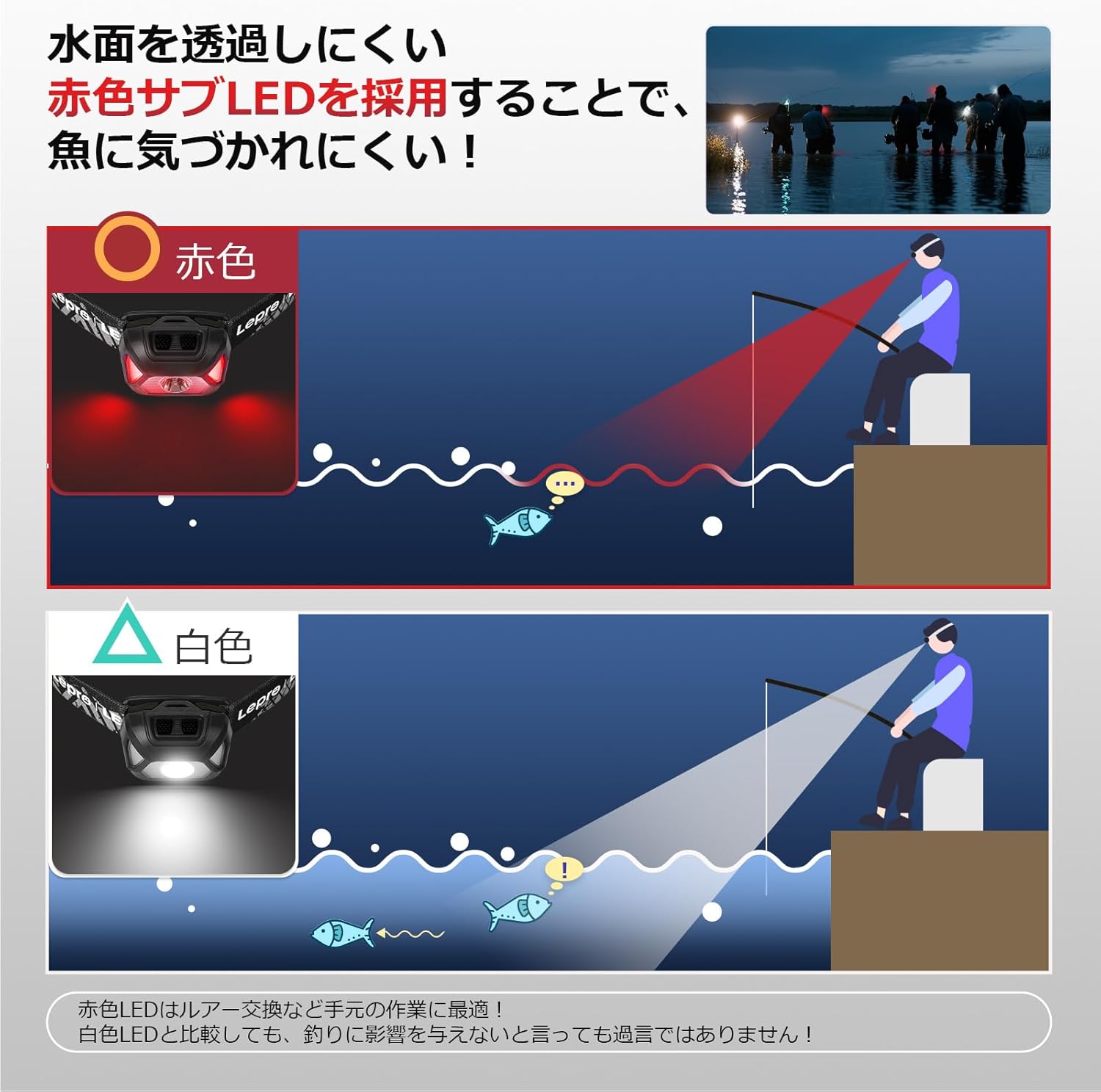 * 紅色LED燈非常適合夜間釣魚,因為它不會警告魚。即使在雨天和霧天等惡劣天氣下也清晰可見,並且易於從遠處檢查,有助於防止事故發生。