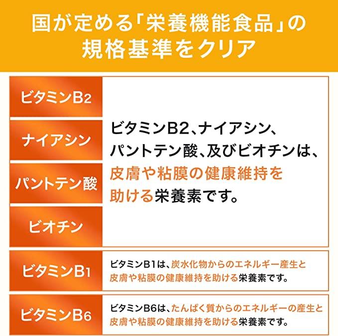 【營養成分資訊】【每1 片545 mg] ]】熱量2.9kcal、蛋白質0.16g、脂肪0.18g、碳水化合物0.16g、食鹽當量0.03g、維生素B1 2.2mg(183)、維生素B2 2.4mg(171 )、維生素B6 3.2mg(246)、維生素B12 6.0 μg (250)、菸鹼酸15 mg (115)、泛酸9.2 mg (192)、生物素45 μg (90)、葉酸200 μg (83)、維生素C 100 mg (100)、維生素D 5.0 μg(91)、維生素E 10.0 mg(159)、維生素P 20mg、β-胡蘿蔔素5400μg