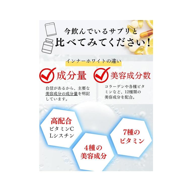 INNER WHITE是Ever Beauty開發的美容補充劑,支援女性的美麗,與精心挑選的美容成分奢華地融合在一起。 它是一款終極的多合一美容補充劑,含有大量的美容成分,如維生素C、L-胱氨酸、膠原蛋白、胎盤素、金松、彈性蛋白等美容成分,不會輸給陽光,讓女性由內而外美麗。