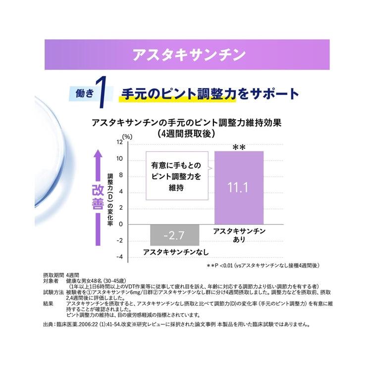 該食品有助於保持手持物鏡頭的對焦能力,減輕眼睛疲勞感,保護眼睛不受光的刺激,減少模糊感,提高視力。為了擁有清晰明亮的每一天,趕快開始早期護理吧!