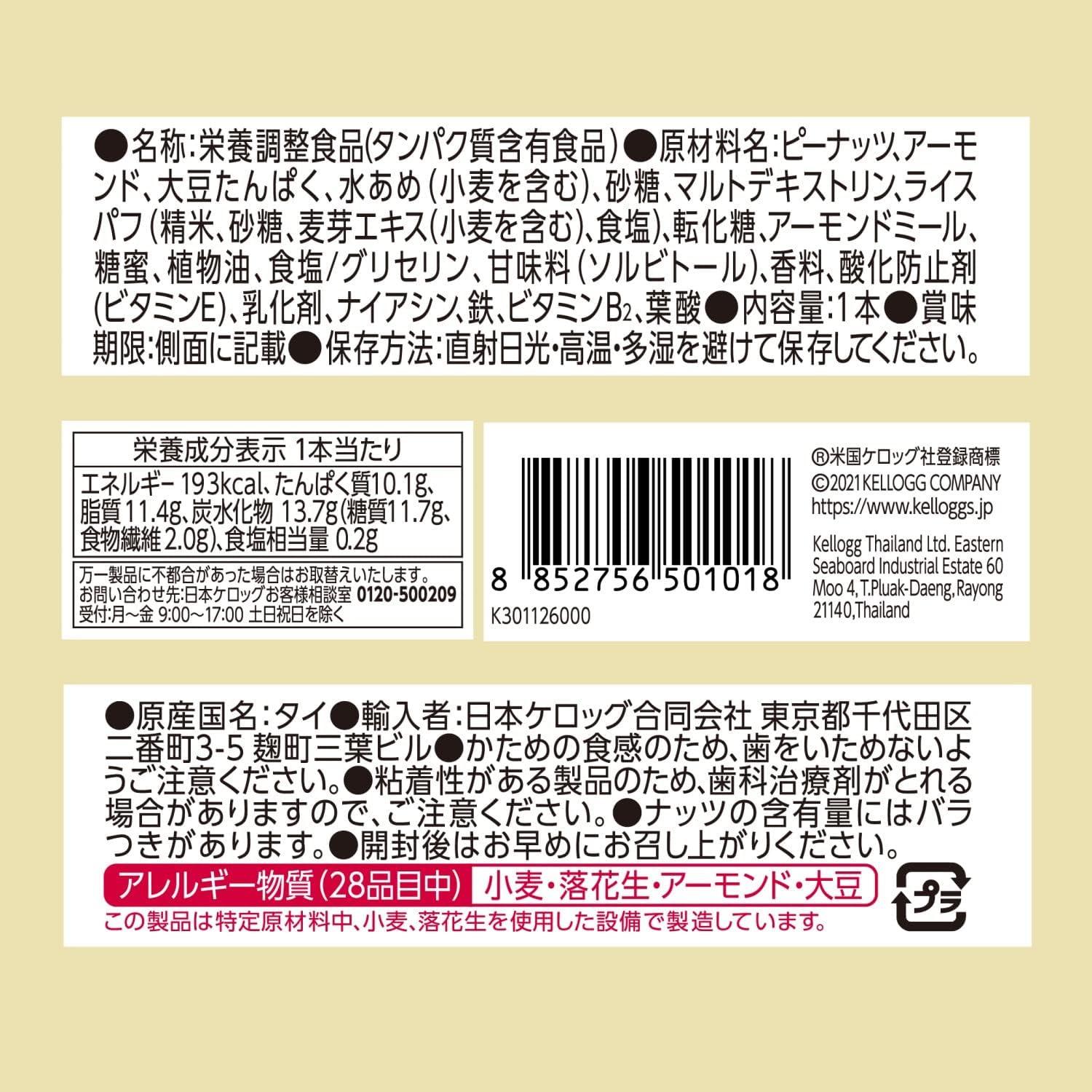 花生、杏仁、大豆蛋白、澱粉糖漿(含小麥)、砂糖、麥芽糊精、膨化米(精米、砂糖、麥芽萃取物(含小麥)、鹽)、轉化糖、杏仁粉、糖蜜、植物油、鹽/甘油, 甜味劑(山梨醇),調味劑,抗氧化劑(維生素E),乳化劑,菸鹼酸,鐵,維生素B2,葉酸