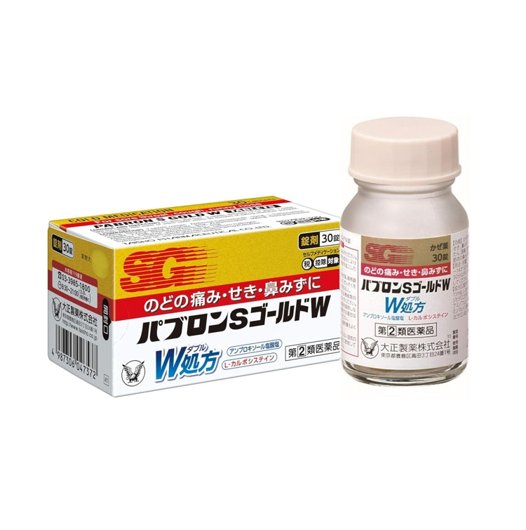 ◆Pabron S Gold W Tablet 含有鹽酸氨溴索、L-羧半胱氨酸、由6種活性成分配製而成,對喉嚨痛、咳嗽、流鼻涕等11種感冒症狀有效。