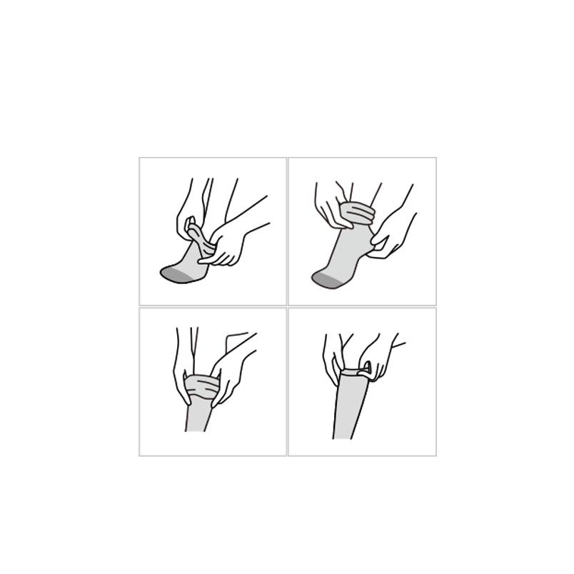 3. 雙手拇指放入襪子內側平均向上拉,將圓形圖樣處對準膝蓋位置。